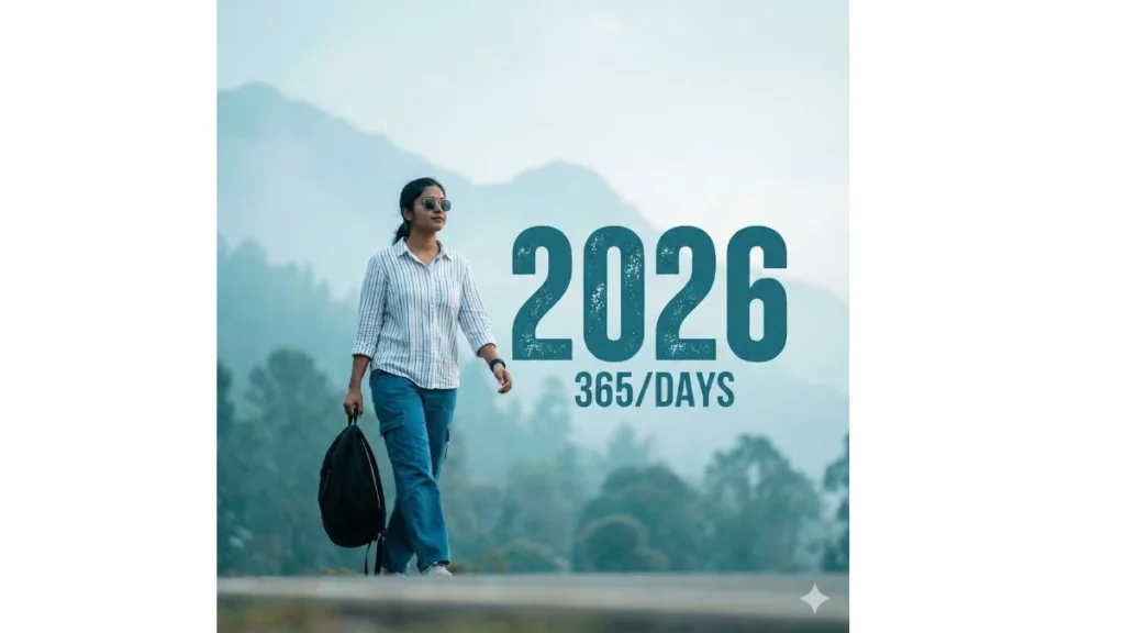 A photorealistic cinematic shot of a young Indian woman walking confidently from left to right across a soft blurred foreground, she is wearing sunglasses, a white and blue striped button-down shirt, blue cargo pants, holding a black backpack in her left hand, background is a misty ethereal landscape dominated by muted teal blue and light gray tones, cinematic lighting, highly detailed, 8k, new yeartheme, Overlay text design: large bold slightly distressed teal font reading”2026″, smaller text below reads “365/DAYS”. Keep the faces exactly the same as the uploaded photos for originality.