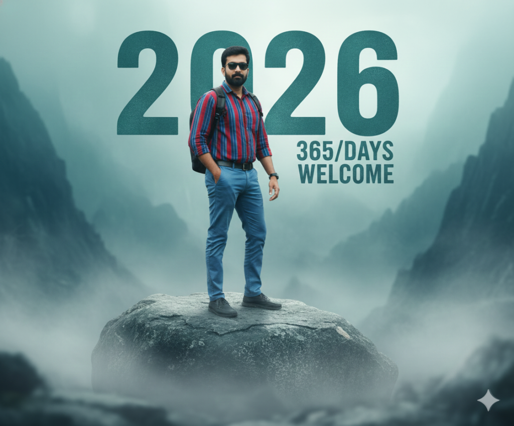 Me, stylish wearing Black sunglasses, red and blue-shirt, blue pants and hand in pocket, wear black backpack standing onbig stone confidently across a soft, blurred foreground. The background misty ethereal landscape, dominated by muted teal, blue and light gray tones subject large style text overlay reads”2026″bold, slightly distressed teal font. Smaller text below it says “365/DAYS” and”WELCOME” Cinematic, highly-detailed, soft lighting,style,new year. face 100 perfect same. 8k resolution and quality.