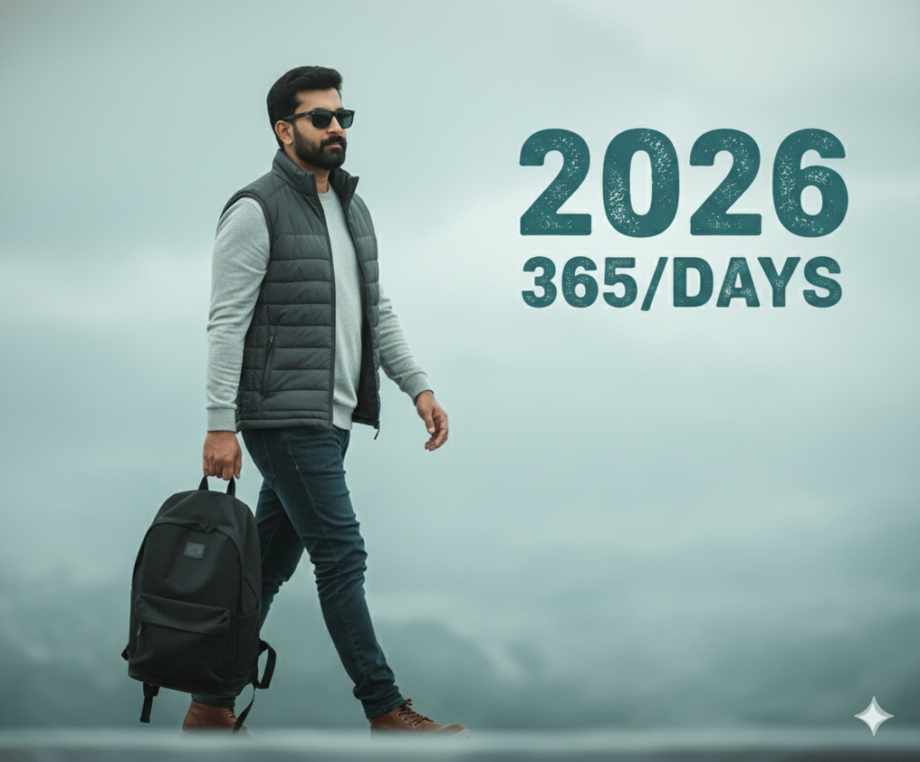 Me, stylish wearing Black sunglasses, red and blue-shirt, blue pants and left hand black backpack walking confidently across a soft, blurred foreground. The background misty ethereal landscape, dominated by muted teal, blue and light gray tones subject large style text overlay reads”2026″ in bold, slightly distressed teal font. Smaller text below it says “365/DAYS” and”WELCOME”. Cinematic, highly-detailed, soft lighting,style,new year. face 100 perfect same. 8k resolution and quality.